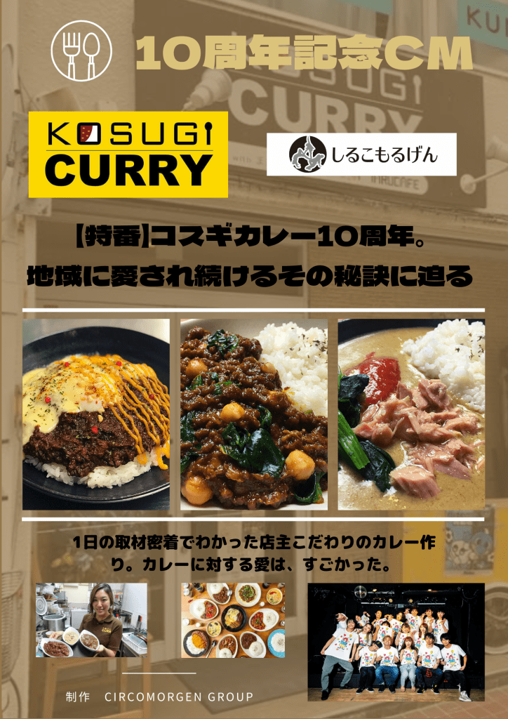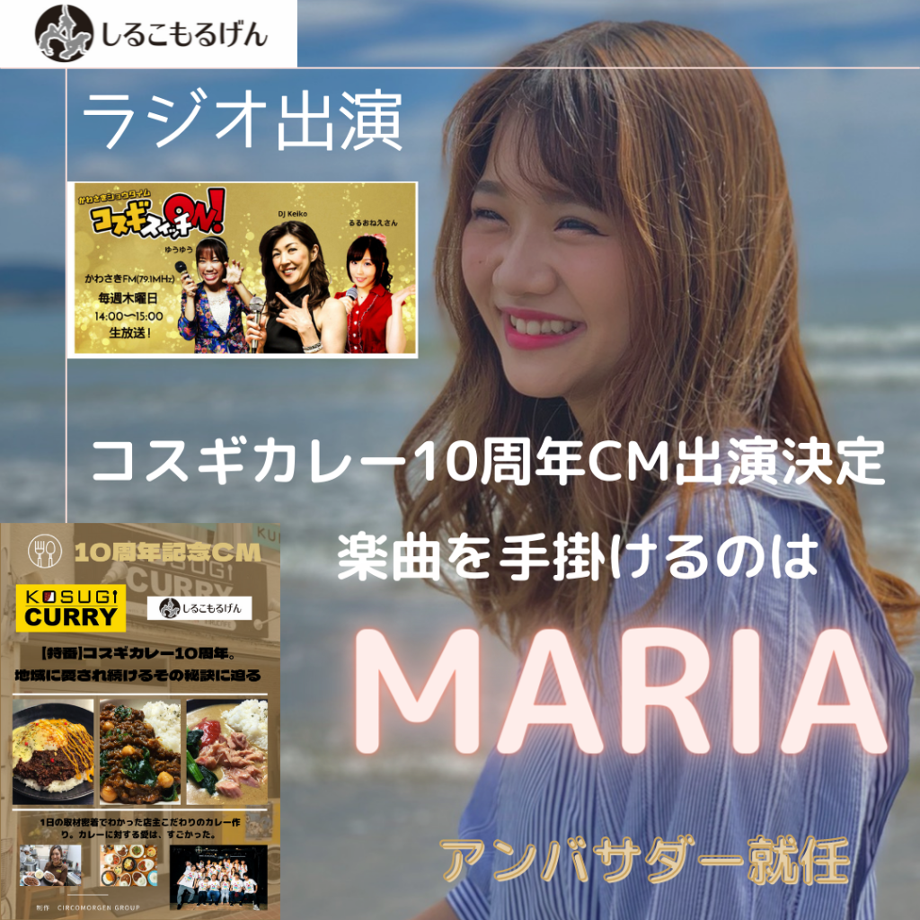 武蔵小杉の創作カレー屋「KOSUGI CURRY」とのコラボが決定いたしました!地域に愛され10周年。「KOSUGI CURRY」さんのテーマ曲を制作し、しるこもるげんでCMを作っちゃいます! 今回、楽曲を手掛けるのは、シンガーソングライター、MARIAです。【エンタメ】で【飲食店】を盛り上げよう企画!果たして、どんな音楽が出来るのか?どんなCMが完成するのか乞うご期待ください!