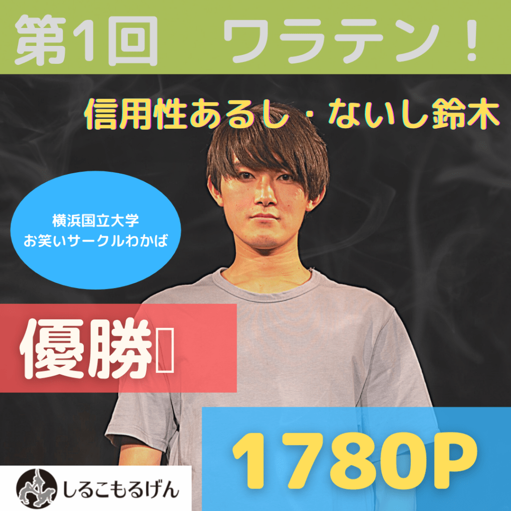 2021年5月24日(月) 川崎市高津区 溝の口劇場にて、ドリームプロジェクトしるこもるげん主催の第1回ワラテン!ネタ収録が行われました。今回は、大学のお笑いサークル、3組が参加。(早稲田大学お笑い工房LUDO 笹口二丁目。上智大学お笑いサークルSCS モラトリアム。横浜国立大学お笑いサークルわかば 信用性あるし・ないし鈴木。)ネタは、ピンでもコンビでも、トリオでも可能で、6月12日(土)~7月3日(土) の3週間で、最も再生回数の多かったチームが優勝でした。